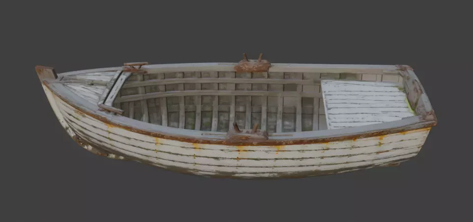 A beautifully worn, photorealistic 3D model of a classic wooden rowboat featuring cracked and peeling white paint, rust-stained oarlocks, mossy waterlines, aged planks, and subtle decay details. Perfect for abandoned lakeside scenes, survival games, horror projects, cinematic atmospheres, or any setting requiring authentic maritime decay. PBR materials, clean topology, fully UV unwrapped and optimized for real-time and high-res use.
