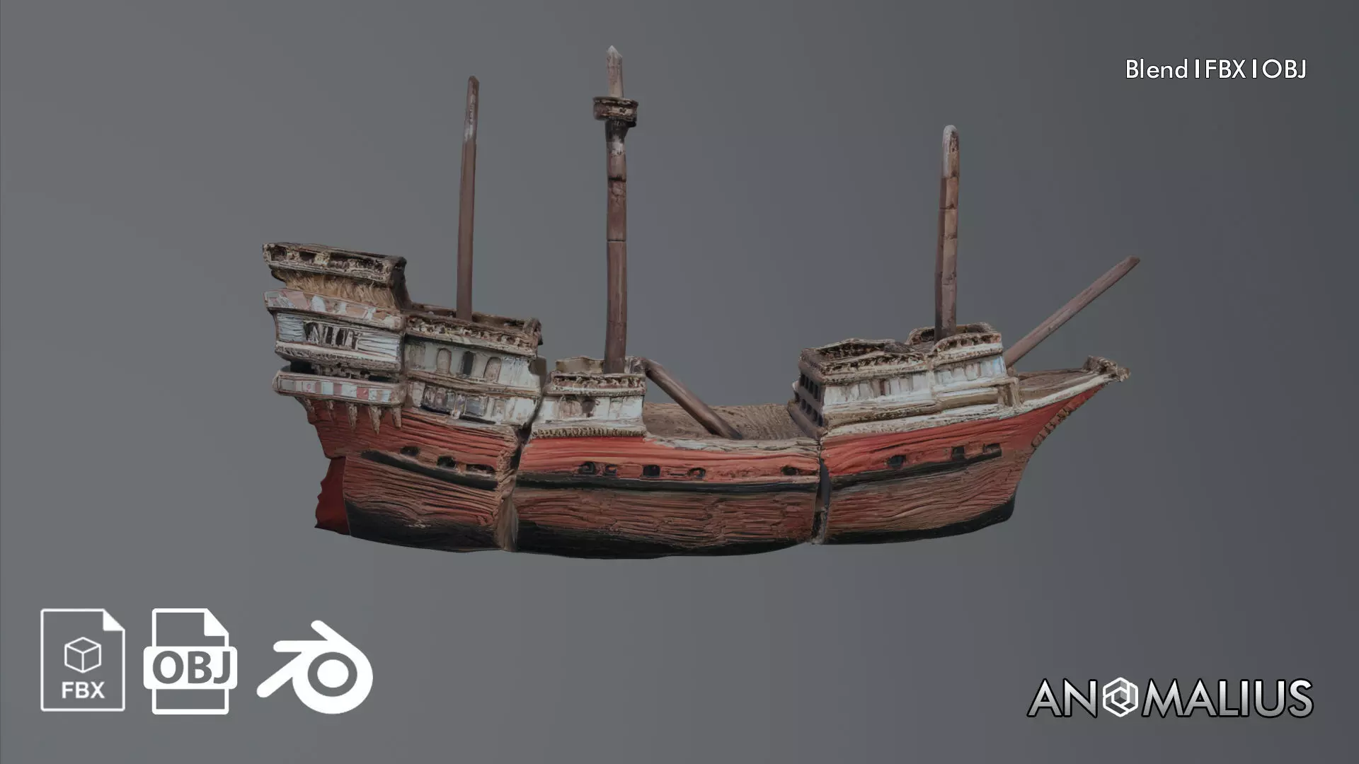 A stylized broken wooden ship featuring a split hull, damaged deck structures, and aged timber details. Designed with a weathered, wrecked appearance, this asset is ideal for shipwreck scenes, coastal environments, or historical settings. Its fragmented structure adds visual storytelling for abandoned or ruined maritime scenarios. Includes FBX, OBJ, and BLEND