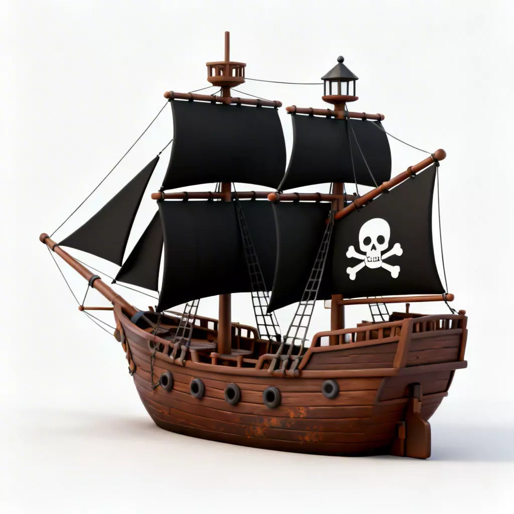 Solid Opaque Black SailsFollowing a specialized design language, the multi-layered square and triangular sails are modeled as thick, solid black surfaces. A primary focal point is the large forward sail featuring a crisp, white Jolly Roger skull and crossbones emblem. This approach strictly avoids any transparency or physics-based cloth simulations, ensuring the asset is highly optimized for performance.