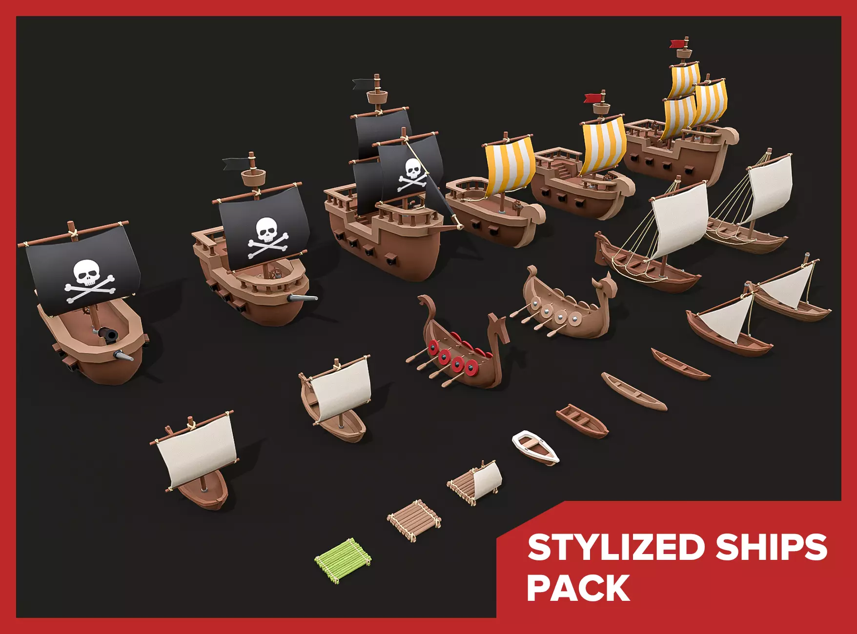 Create an atmosphere of maritime adventures and epic battles with this pack of stylized ships! This package includes a wide variety of vessels – from imposing pirate galleons and Viking drakkars to elegant trading ships and simple rafts.