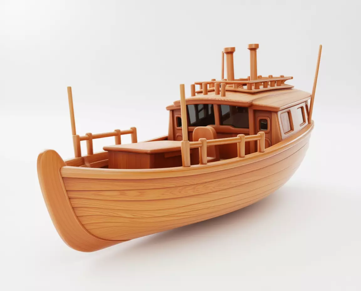 Download the charming 3D model of a wooden fishing boat, a digital recreation of a classic, handcrafted vessel designed to evoke the simplicity, utility, and timeless beauty of coastal life. This fishing boat 3D model features a long, slender hull crafted from rich, warm-toned wood — showcasing deep, flowing grain patterns in shades of amber, honey, and golden brown that highlight its natural beauty. The boat’s form is defined by its gracefully curved bow and stern, each rising to a gentle point that enhances its streamlined silhouette. A small, enclosed cabin sits at the rear, detailed with windows, a door, and a roofline adorned with simple railings and two vertical posts — suggesting a functional, working vessel. Inside, the cabin displays subtle structural details: a bench seat, a small table, and visible interior framing that suggest comfort and practicality. The open deck features sturdy wooden railings along both sides, with vertical stanchions and horizontal rails that add to its authentic, handcrafted appearance.