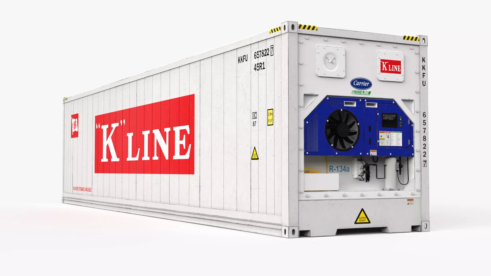 High quality shipping container model equipped with reefer CARRIER. Shipping Company- K-LINE. Refrigerated by Carrier Container type- 40 feet High Cube. Modeled in Maya 2023. Real-world scale. All textures with 4096x4096. Maps- Diffuse, Glossiness, ior, Normal map, Refection, Opacity. Extra PBR maps- Occlusion, Metallic, Roughness.