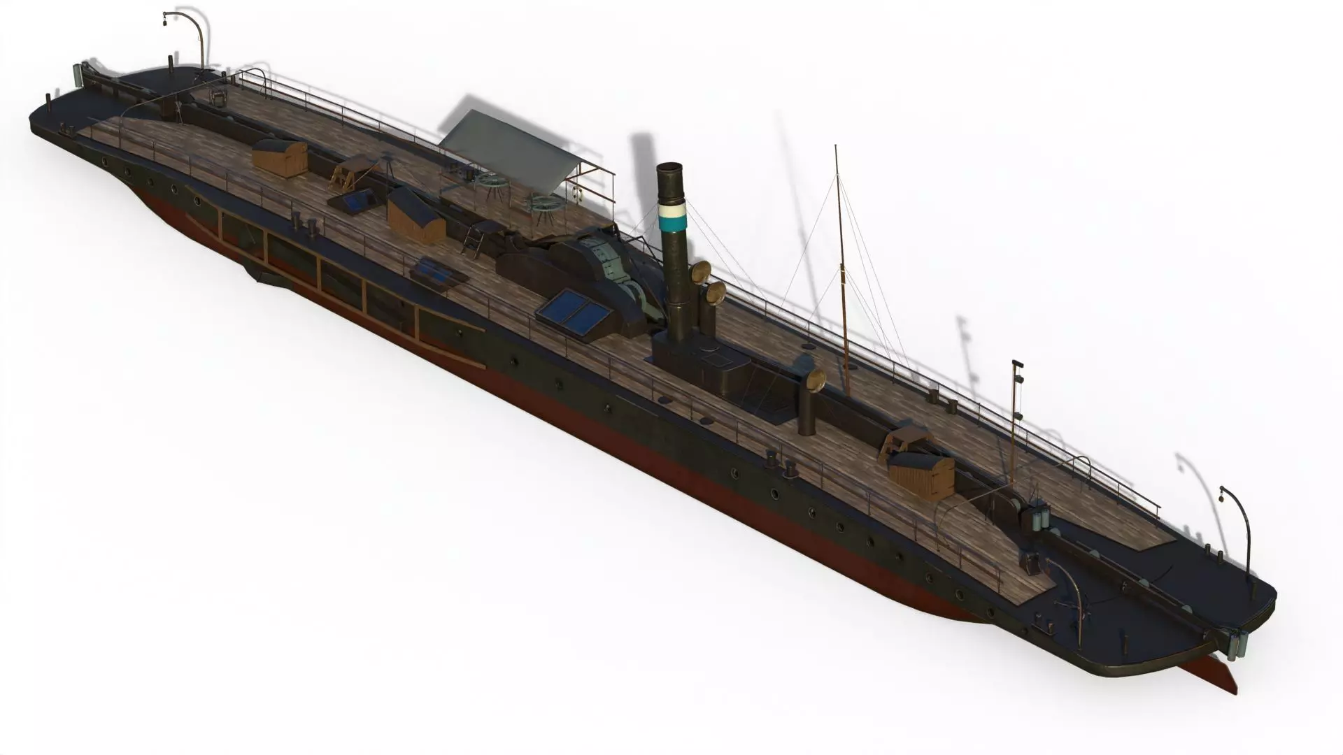 The chain was raised out of the water over a boom at the bow of the ship and led over the deck along the ship’s axis to the chain engine amidships. From there the chain was led over the deck to another boom at the stern and lowered once more into the river. By moving the stern boom and the two rudders, front and aft, from side to side it was possible to replace the chain in the centre of the river again, even when negotiating river bends.