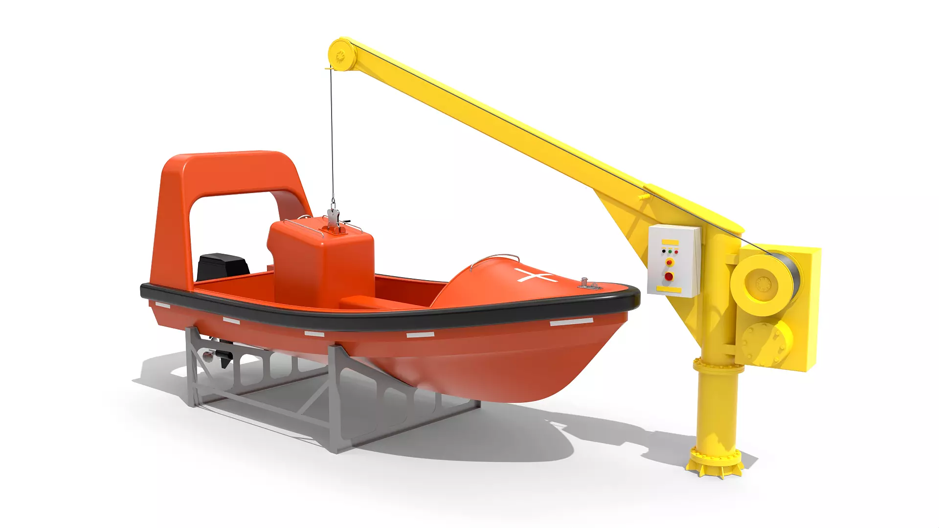 Detailed model of a SOLAS Fast Rescue Boat (FRB) / Fast Rescue Craft (FRC) with outboard motor incl. Davit. Scaled 1:1 (6.2m length). A Fast Rescue Craft (FRC) is a specialized high-speed vessel designed primarily for Search and Rescue (SAR) operations and recovering persons from the water (Man Overboard - MOB).