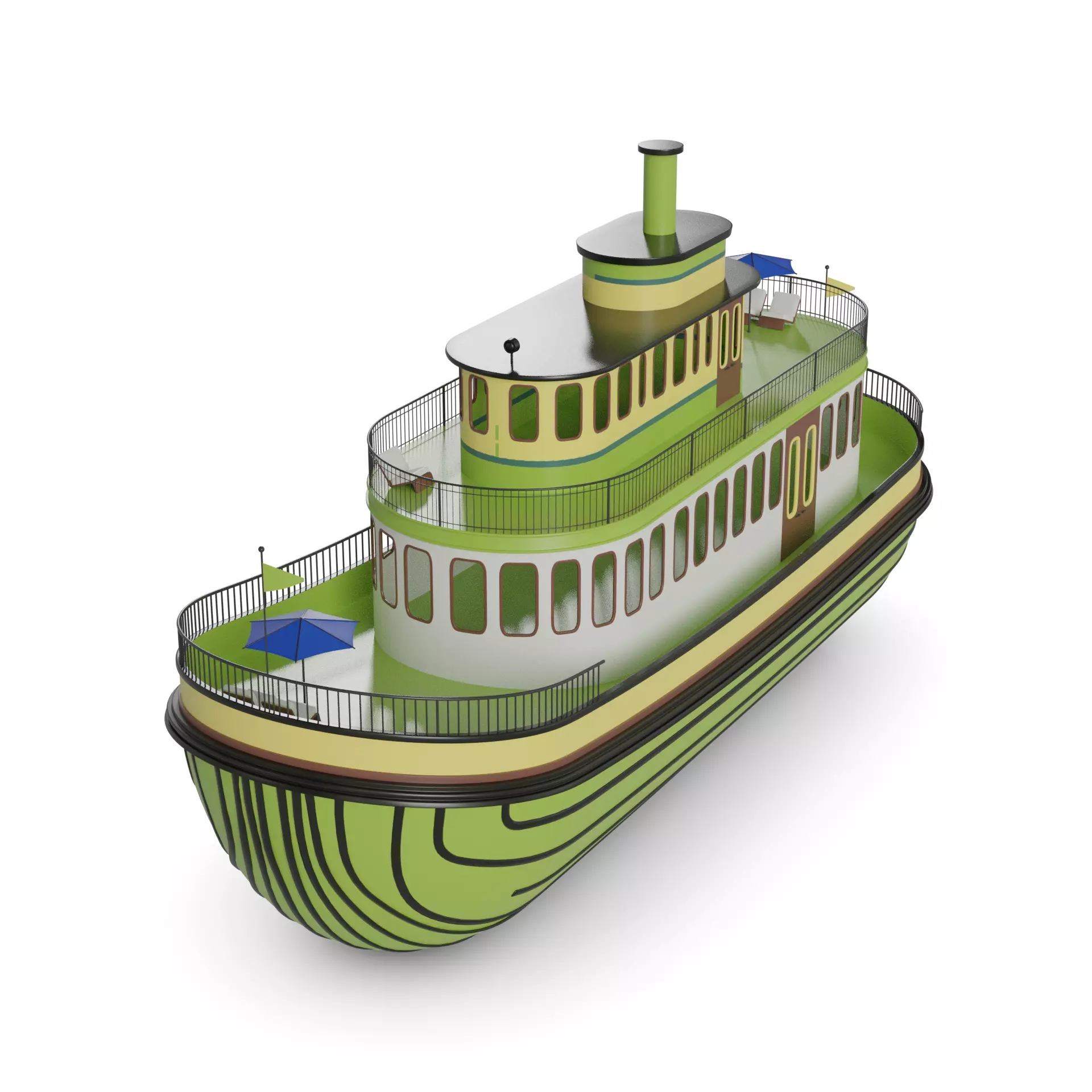 4 A unique car ferry with a green and yellow striped pattern, showcasing a retro design with rounded edges and a playful aesthetic. The ferry stands out on the water with its bold colors and quirky style, offering a fun and memorable experience for passengers in the current timeline.