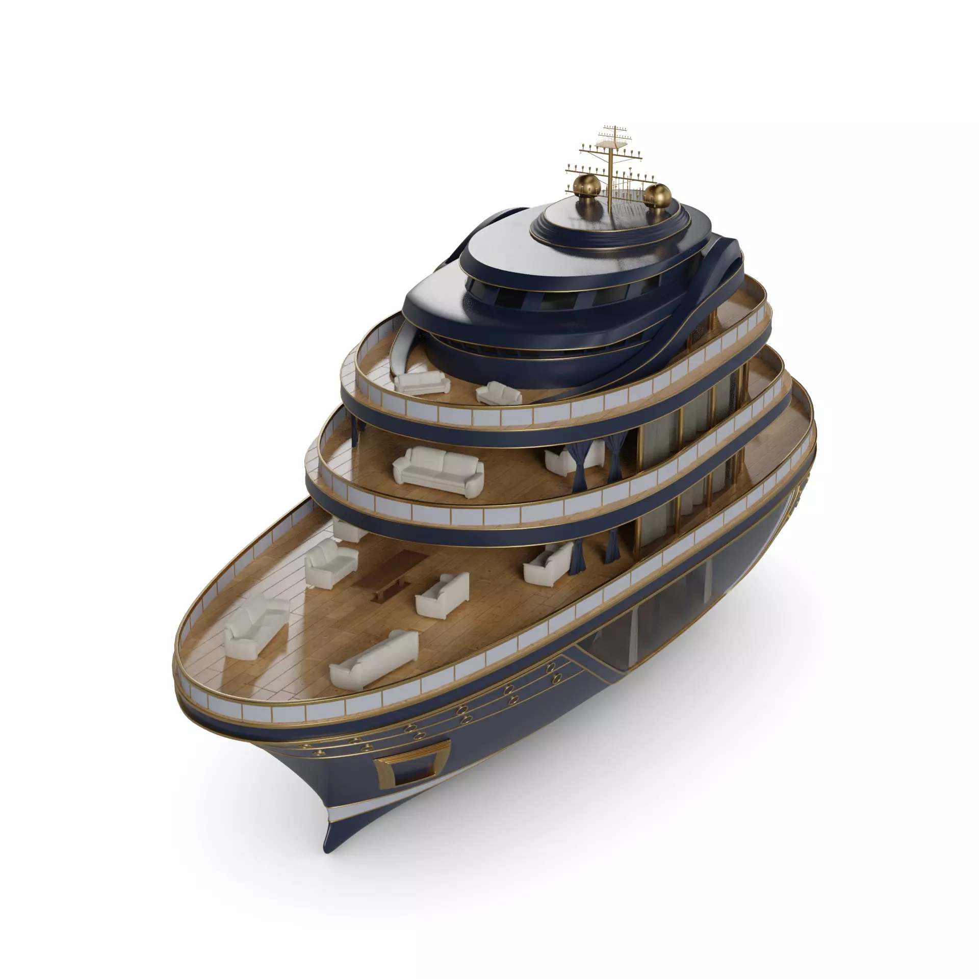 4 A luxurious passenger ferry designed for comfort and style, featuring a sleek black hull and elegant gold accents. The ferry boasts multiple decks with VIP lounges, a gourmet restaurant, and a spa for passengers to indulge in during their journey. The interior is lavishly decorated with plush furnishings and ornate details, creating a sophisticated ambiance for travelers.