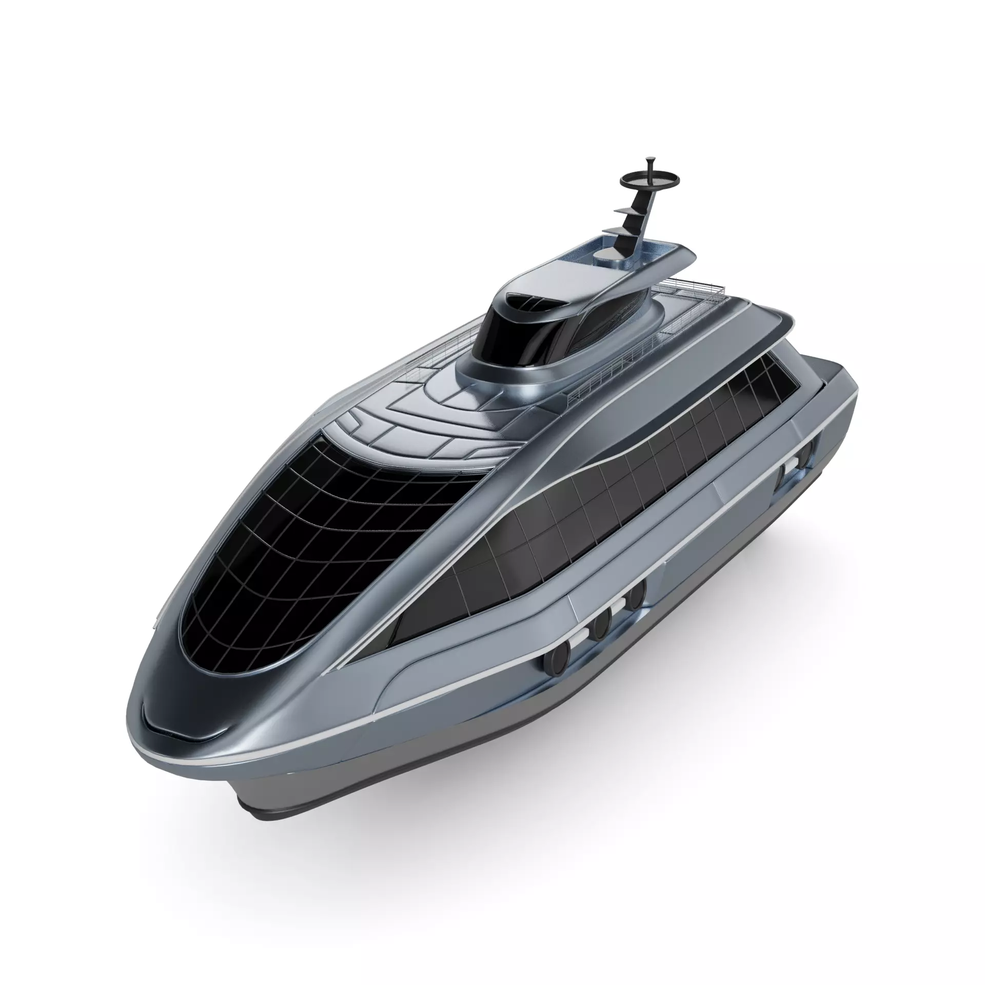 A sleek, futuristic passenger ferry with a streamlined design, featuring a metallic silver hull and large panoramic windows that offer stunning views of the surrounding waterways. The ferry is equipped with advanced propulsion technology, gliding effortlessly through the water with minimal noise and emissions, providing a luxurious and environmentally friendly transportation experience for passengers.