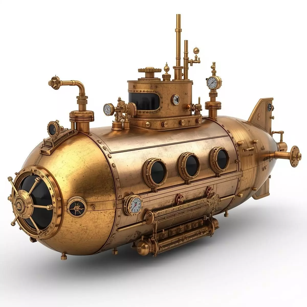 Steampunk Mini Submarine 3D ModelDescriptionA premium, high-quality 3D model of a compact mini submarine designed with a sophisticated Victorian industrial underwater aesthetic. The vessel features a cylindrical brass hull reinforced with riveted metallic plates and ornamental banding throughout the chassis.