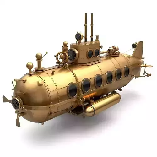 Steampunk Mini Submarine 3D ModelDescriptionThis premium 3D model depicts a compact industrial submarine featuring a sophisticated Victorian steampunk aesthetic. The vessel is designed with a polished cylindrical brass hull that is heavily reinforced with riveted metallic plates and decorative banding. It includes a large armored forward porthole and several circular side windows, all utilizing dark smoked glass for a high-contrast appearance. The exterior is highly detailed with external copper steam pipes, analog depth gauges, and vertical antennas. This asset is an excellent choice for deep-sea exploration scenes or as a specialized vehicle in underwater environments for steampunk-themed games.