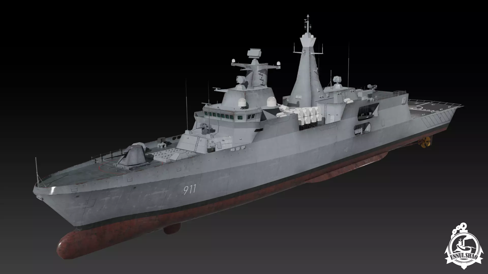 Algerian navy frigate El-Moudamir, a variation of MEKO A200 game ready model. Modeled with blender 3.5. The model has 139021 tris and 78085 vertices. PBR material and UV mapped. 12 materials and 36 textures included in this model. The largest size of texture is 4096x4096, all textures are square. OBJ and FBX format supported.