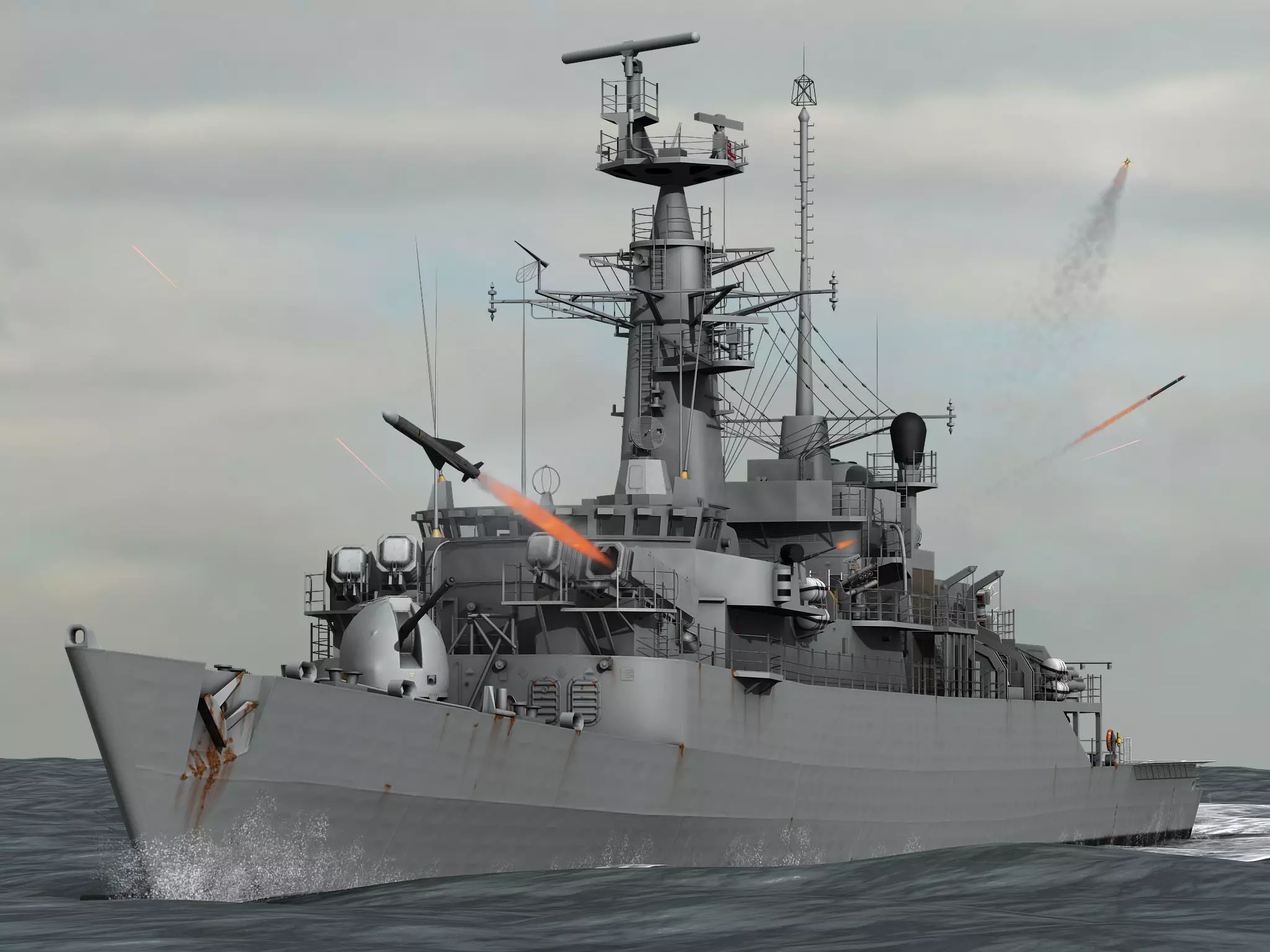 I've based the model & textures on the standard configuration as per the 1982 Falklands conflict, with painted out markings & with 4x MM38 Exocet anti-ship missile, but not on any particular ship in the class.