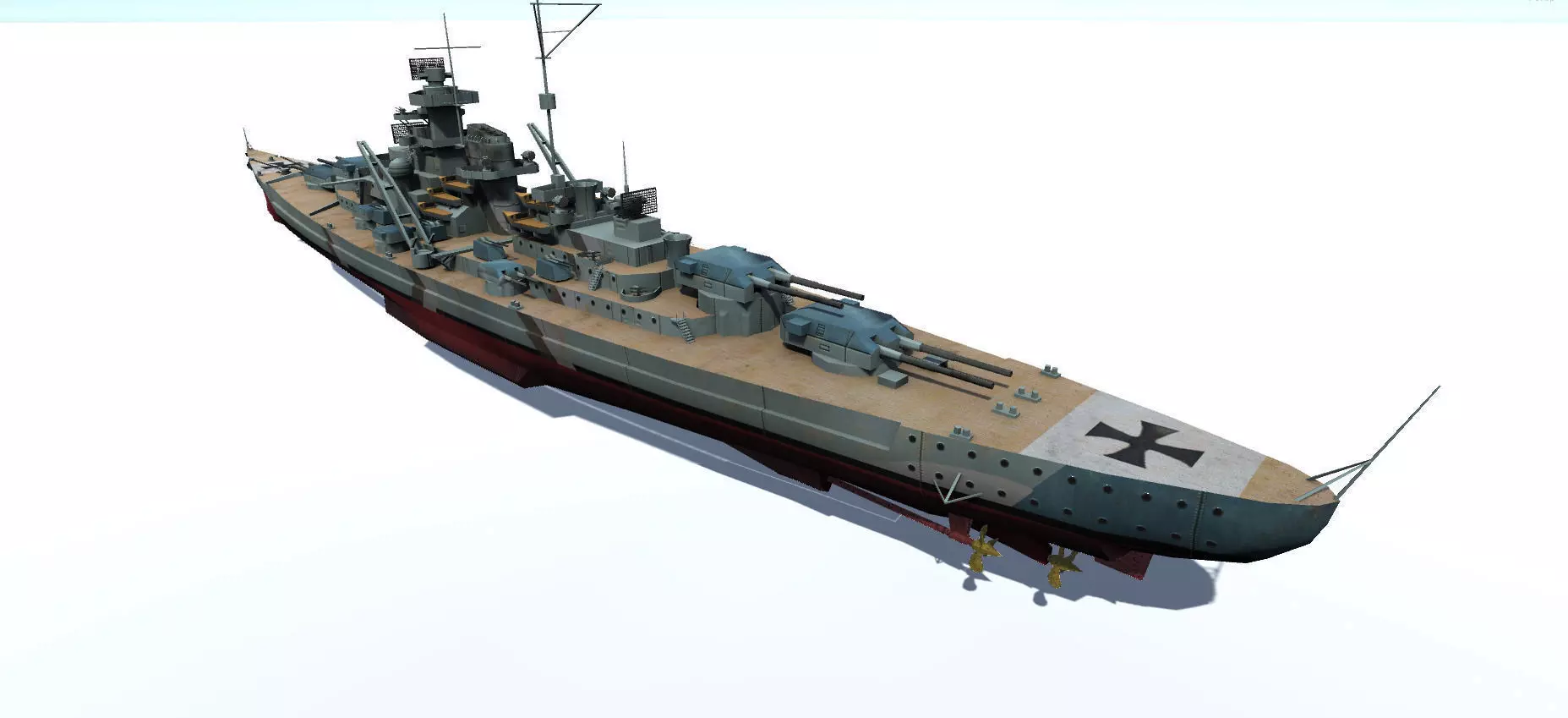 Bismarck battleship lowpoly game model with 2048*2048 PBR textures, and separated propellers, airplane for animation.