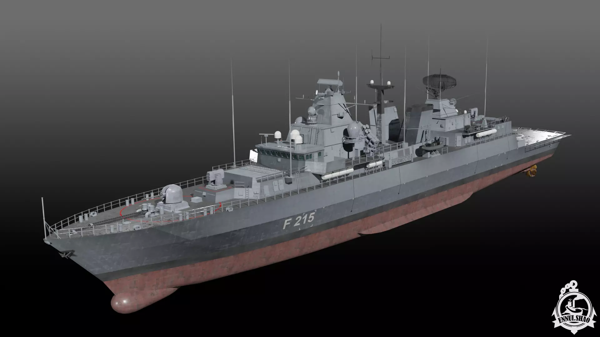 German navy F123 Brandenburg class frigate modeled with blender 3.3. 47 textures used, PBR material. The model is UV mapped and game-ready. OBJ and FBX format supported.