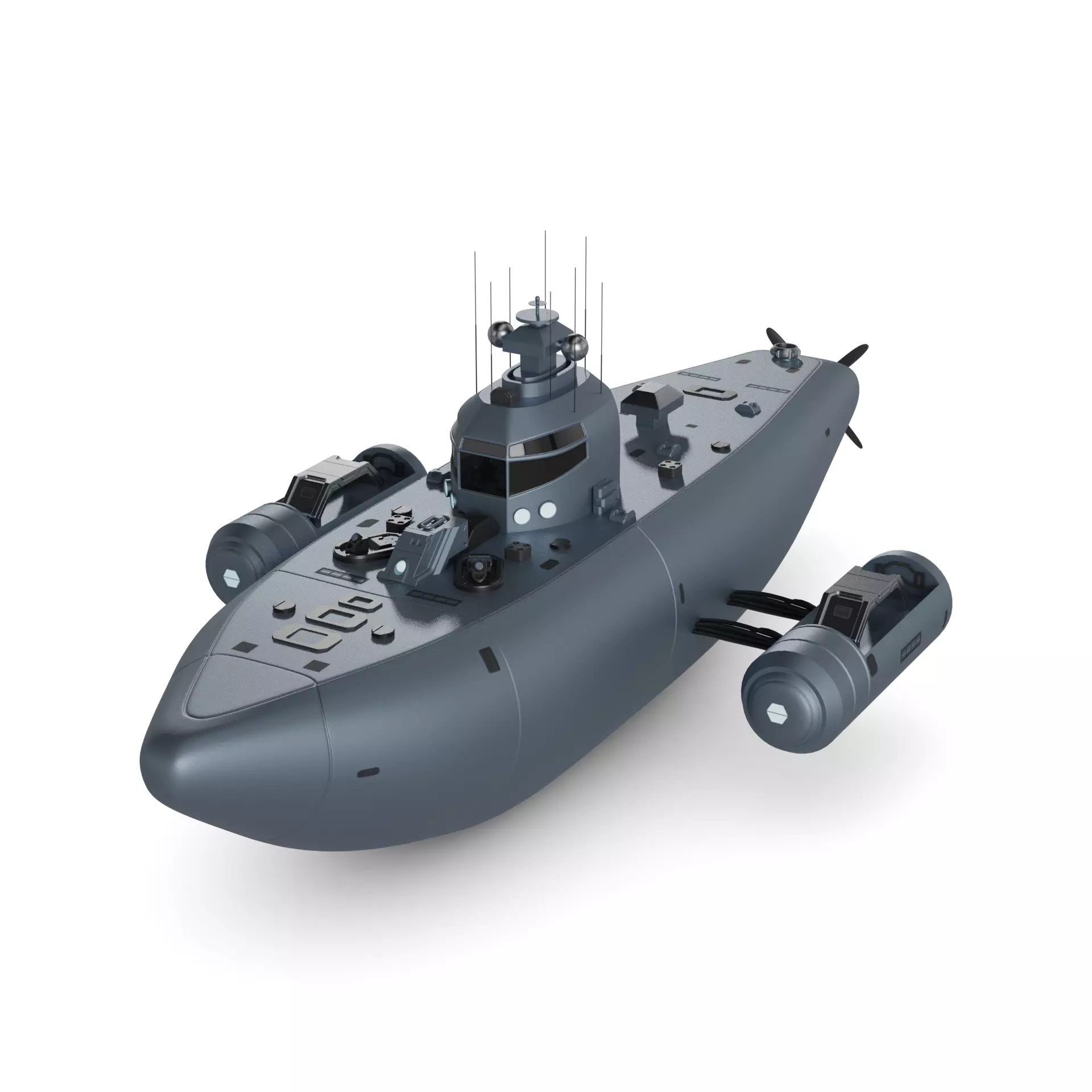 A sleek and futuristic Mine Countermeasure Vessel designed for underwater military operations, featuring a streamlined shape with a metallic silver finish, equipped with advanced sonar technology and robotic arms for detecting and disarming underwater mines in the depths of the ocean.