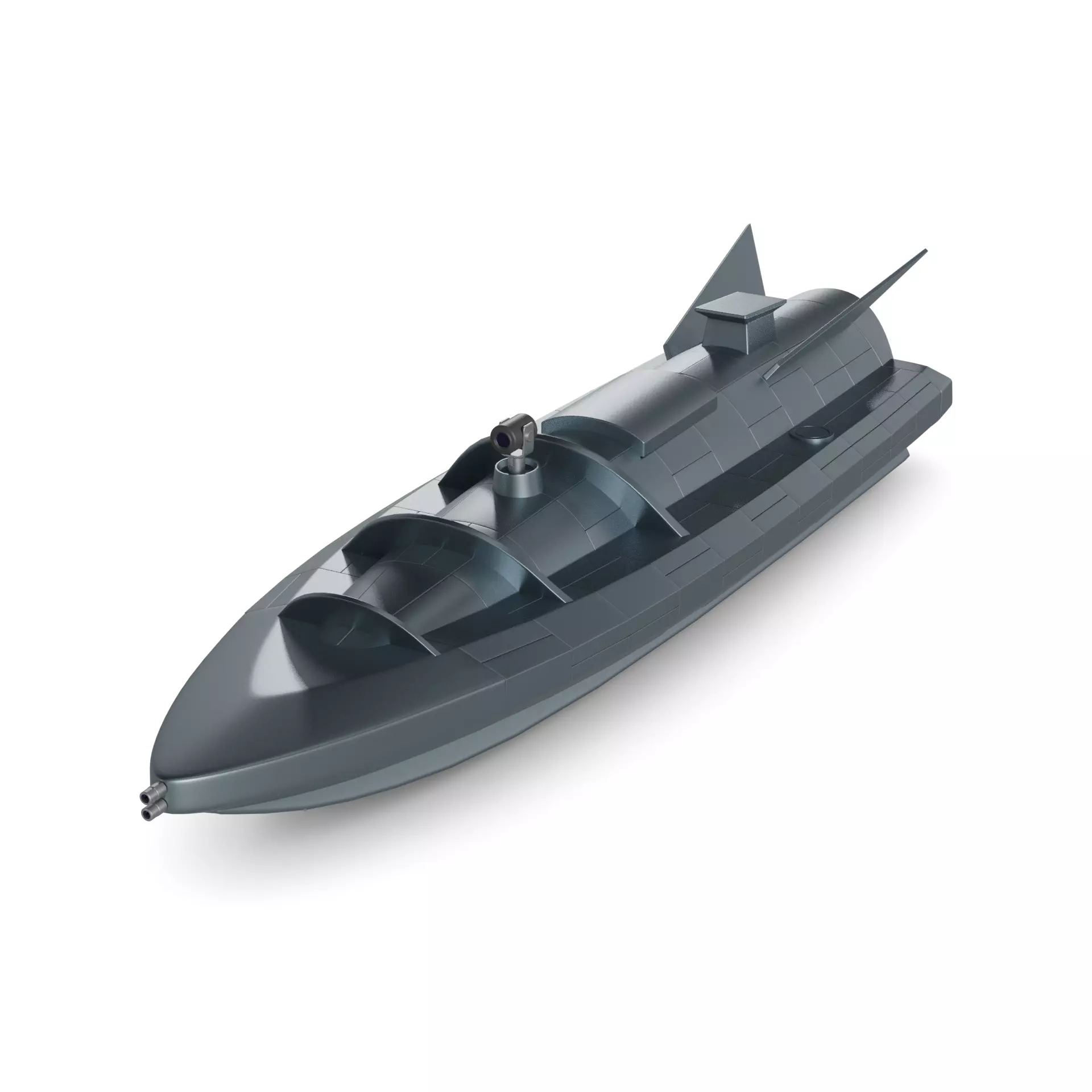 A sleek and streamlined naval drone with a metallic gray exterior, equipped with advanced surveillance technology, designed to blend seamlessly into the ocean waters of the historical timeline.