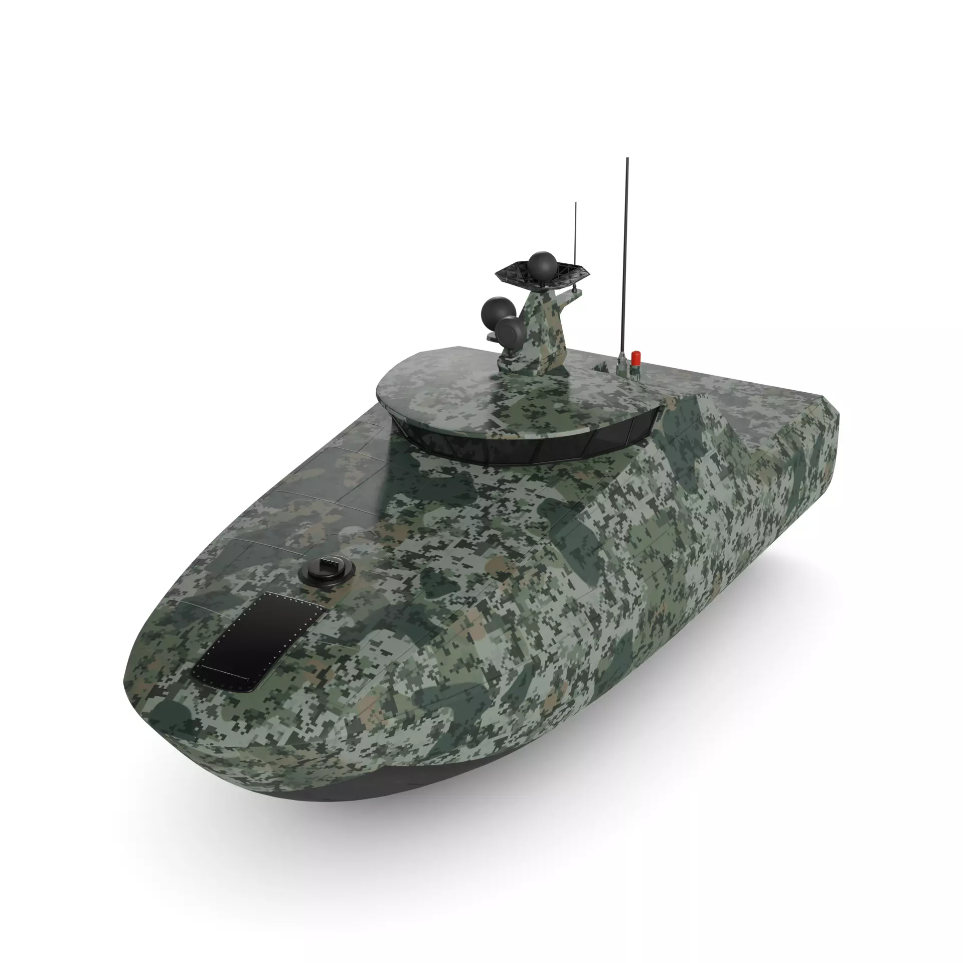 An agile, camouflaged autonomous vessel in shades of green and brown, blending seamlessly with the ocean environment, outfitted with stealth capabilities and rapid deployment mechanisms, tailored for covert operations and intelligence gathering in the current timeline.
