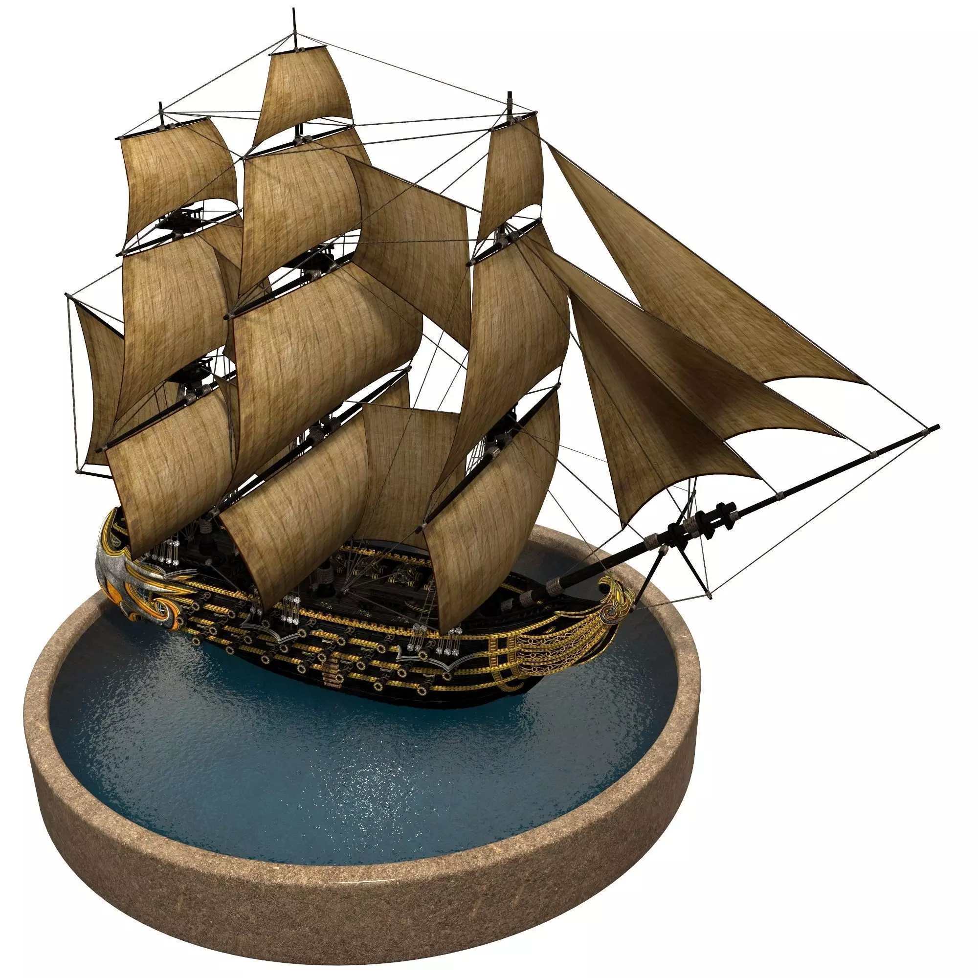 Three-deck linear battleship modeled in a pirate fantasy style. Three upgrades for armor, speed and ram.Ready for using in games. Textures are in .png file format in 1024px. Model is in .fbx, .obj, .max file formats. 2 animated sails set. Rendered with V-ray 3. Contains light, camera and hdri environment map.