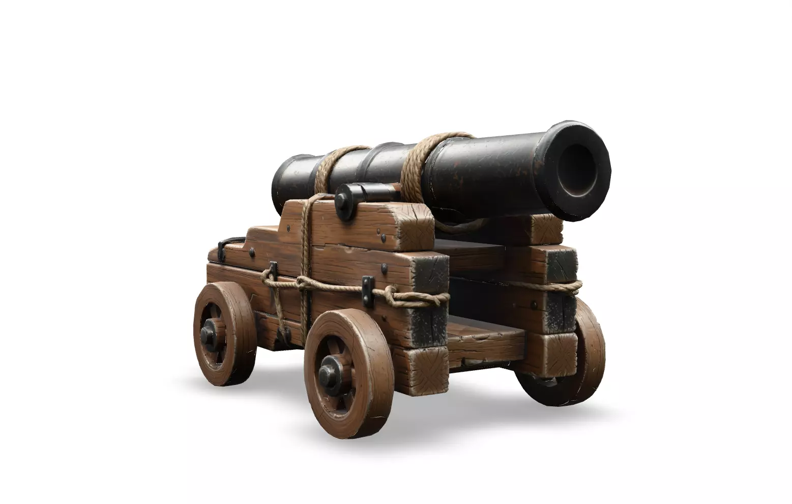 The model features realistic wear and tear, showcasing oxidized dark metal, weathered wood grain on the carriage and wheels, and intricate rope bindings. Designed with optimization in mind, this asset looks AAA-quality while maintaining a highly efficient polygon count of just 15k, making it ideal for both PC/Console and demanding mobile projects.