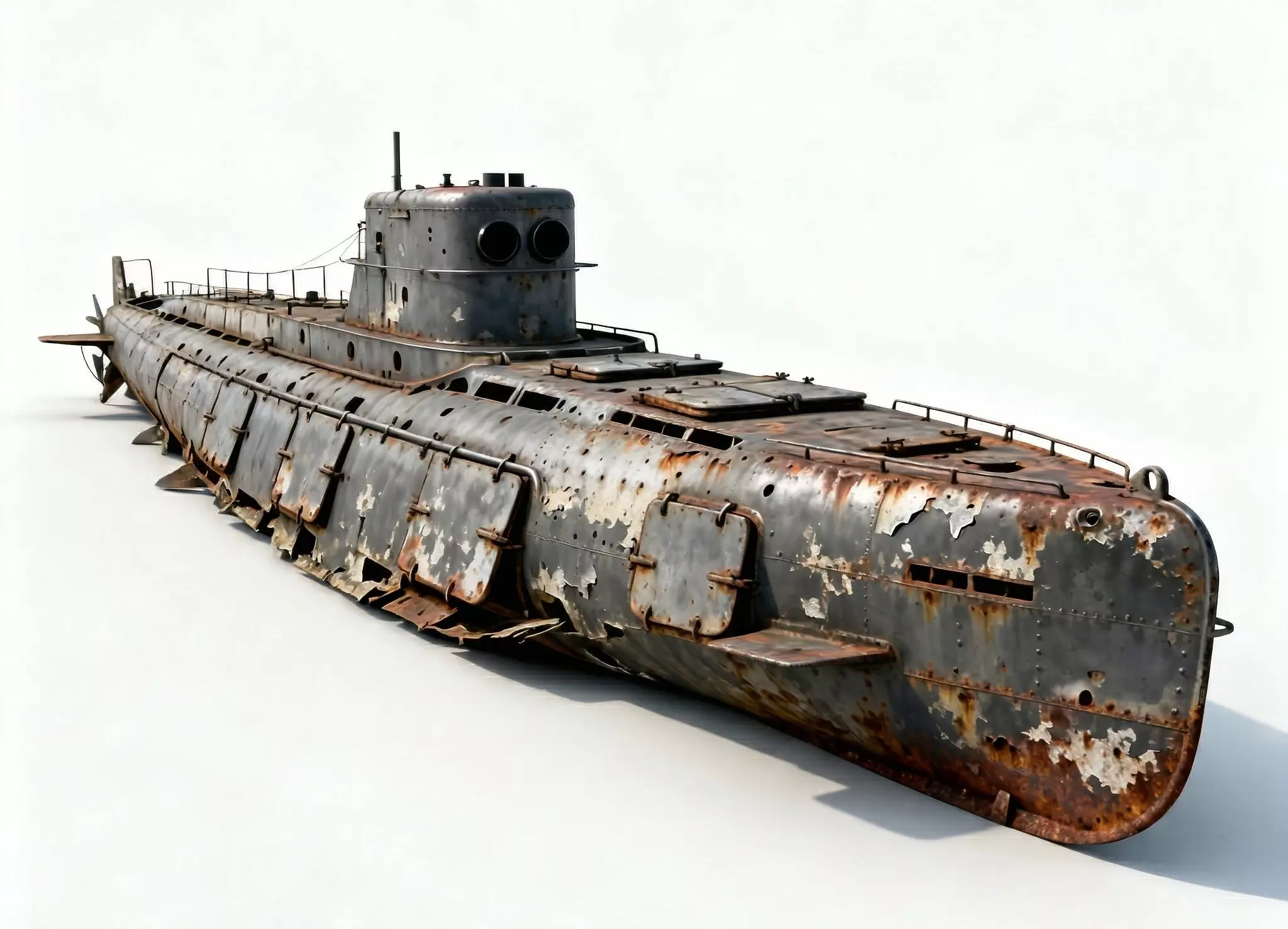 Oxidized Steel and Peeling Grey Hull FinishThe submarine features a primary body finish of heavily oxidized naval steel and tattered grey-blue paint, meticulously modeled with realistic surface pitting, massive iron-oxide crusting along the waterline, and prominent salt-spray tarnish. This professional and grounded appearance provides a clear visual story of decades of environmental neglect and harsh maritime exposure, providing a sharp visual contrast against the dark internal shadows of the open hatches and torpedo tubes.