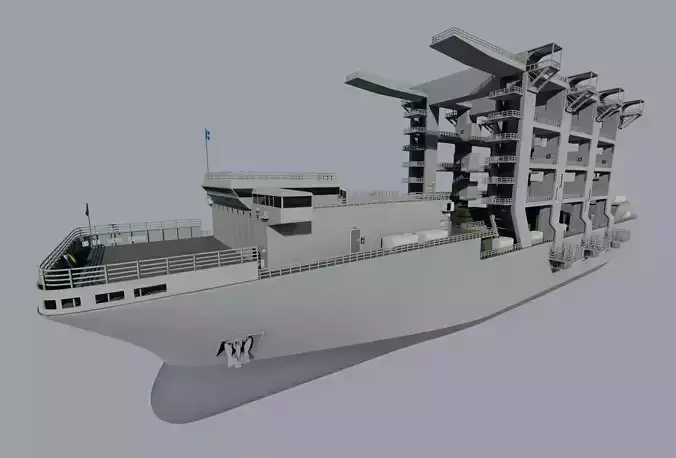 A sturdy replenishment ship with a bulky structure, covered in a camouflage pattern to blend in with the surrounding waters, adorned with large cranes and storage tanks to transfer supplies to other naval vessels, designed for efficiency in modern naval operations.