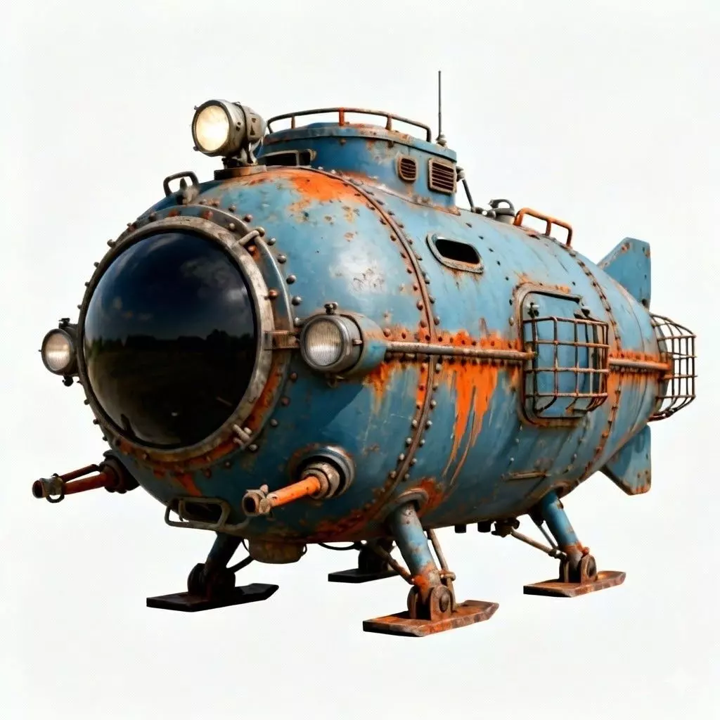 The Overall Concept This is a relic of early deep-sea exploration. Unlike the sleek cyber-sub, this vessel looks heavy, industrial, and built to survive crushing pressure through sheer mass rather than technology. It fits perfectly into a dieselpunk setting, a shipwreck scene, or a historical underwater adventure.