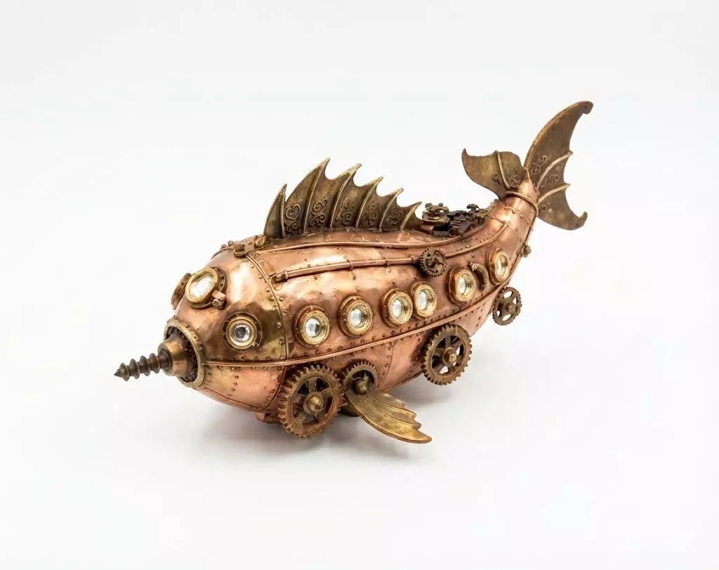 Ornate Fin Plating The dorsal fin and tail are designed with decorative scrollwork and layered metal scales. This artistic touch implies that the builder cared about beauty as much as function, fitting the aesthetic of a high-class eccentric inventor.