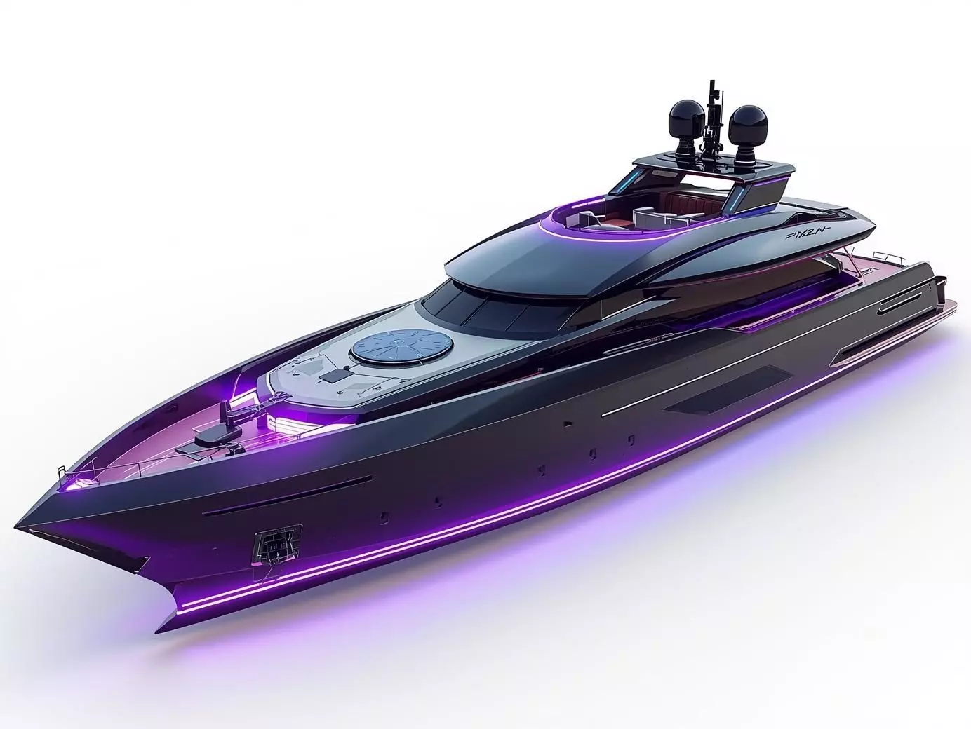 Neon Luminescent Interfaces: Showcases integrated purple light-strips along the waterline and deck edges, with cyan highlights on tactical sensor arrays.