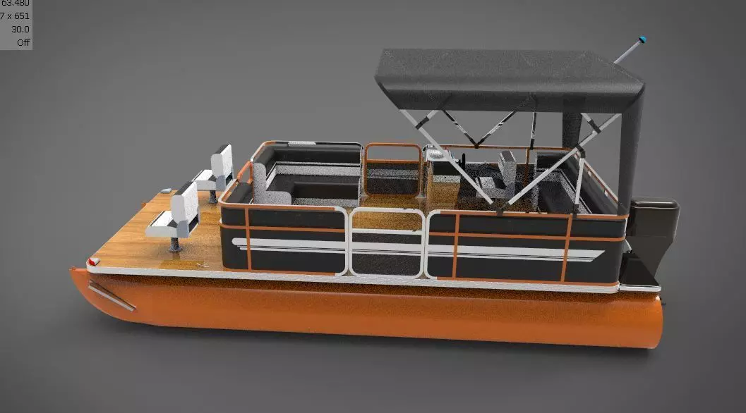 The 3D model design of a lake pontoon boat captures the unique structure and functionality of these versatile watercraft. The model showcases a stable, wide platform supported by twin or triple pontoons that provide exceptional buoyancy. The spacious deck is designed with ample seating and space for various activities, with detailed features like comfortable cushioned benches, a pilot's console, and a sturdy railing for safety. There's often a retractable canopy to provide shade, and the deck layout can include additional elements like a table, storage compartments, and even a small kitchenette for extended outings. This 3D model accurately represents the balance of leisure and practicality, illustrating why pontoon boats are popular choices for relaxed days on the lake