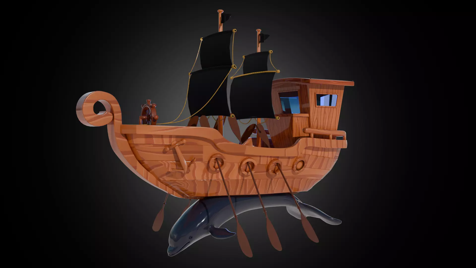 Stylized Fantasy Design – a magical wooden ship carried by a dolphin, perfect for fantasy scenes, animations, or games.