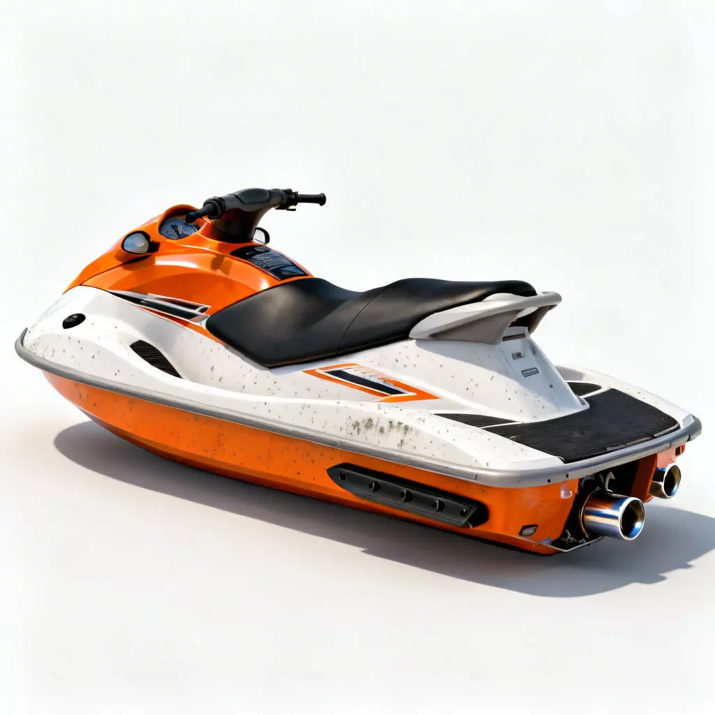 Weathered Composite and Rubberized FinishThe jet ski features a primary dual-tone orange and white composite body paired with a black rubberized seat and rear deck pads. The surface is meticulously modeled with realistic surface scuffs, localized grime accumulation, and subtle paint wear along the hull, providing a professional and grounded appearance that tells a clear story of frequent outdoor use in marine environments.