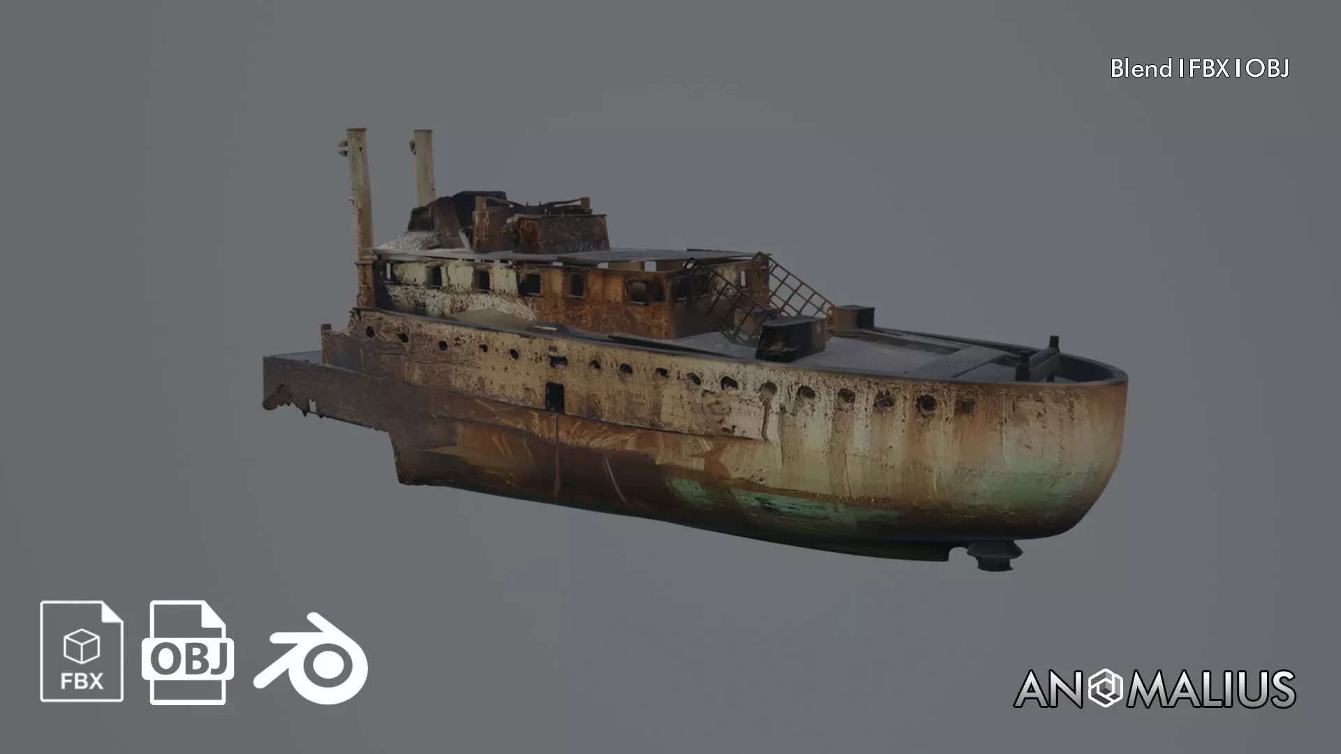 rusted industrial ship featuring a heavily corroded hull, worn metal surfaces, and aged structural elements. Designed with a decayed, abandoned look, this vessel is ideal for post-apocalyptic, maritime, or horror environments. Includes FBX, OBJ, and BLEND formats, optimized for real-time use