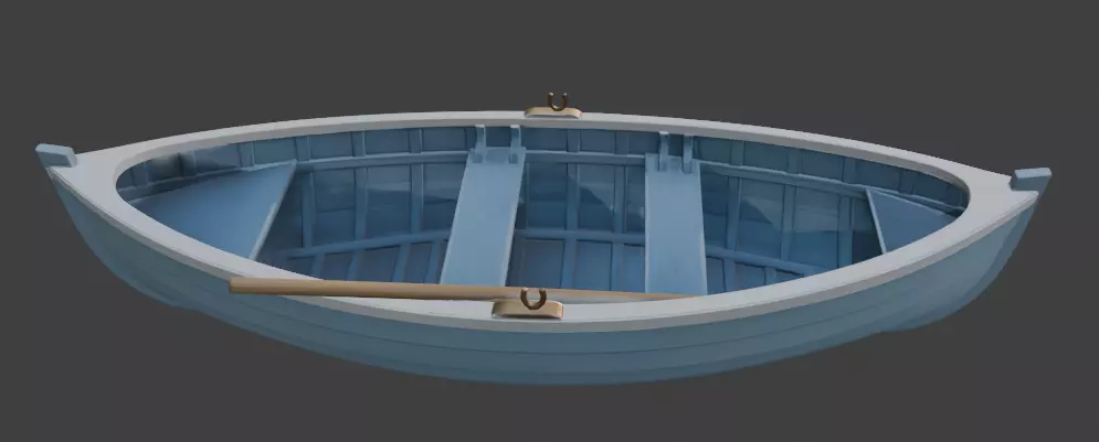 A charming, pristine 3D model of a traditional wooden rowboat featuring soft sky-blue painted hull with crisp white trim, natural wood thwarts, oarlocks, and a single oar. Simple, clean topology and PBR materials make it perfect for calm lake scenes, children’s renders, coastal environments, games, animations, or any peaceful water setting requiring a timeless small boat.