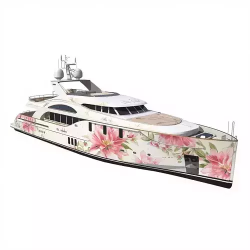 This high-fidelity 3D model represents a premium Spring Edition luxury sport yacht, featuring a fresh and elegant aesthetic designed for seasonal maritime visualizations. The asset is finished in a pearl-white and soft-cream color scheme, adorned with intricate pink and green floral patterns along the hull and superstructure. It is engineered with professional PBR (Physically Based Rendering) materials, ensuring a realistic and sophisticated presentation.
