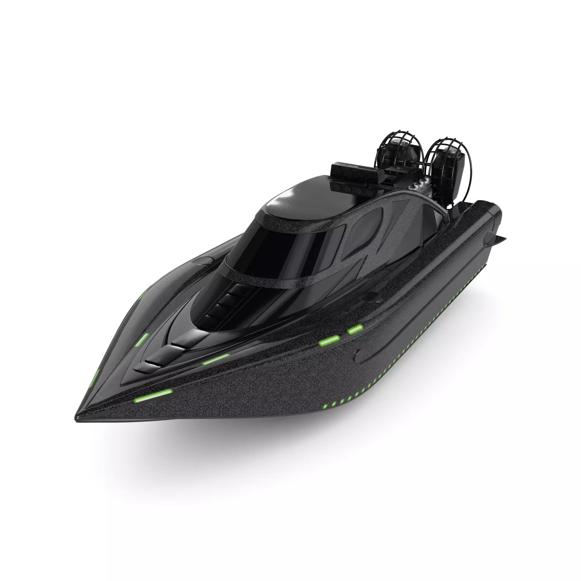 A futuristic recreational airboat with a cutting-edge design, featuring a sleek black carbon fiber hull and neon green accents. The boat is equipped with advanced technology, including LED lights that illuminate the water at night and a touch-screen control panel for easy navigation. The streamlined shape and angular edges give it a dynamic and modern look, perfect for thrill-seekers on the water.