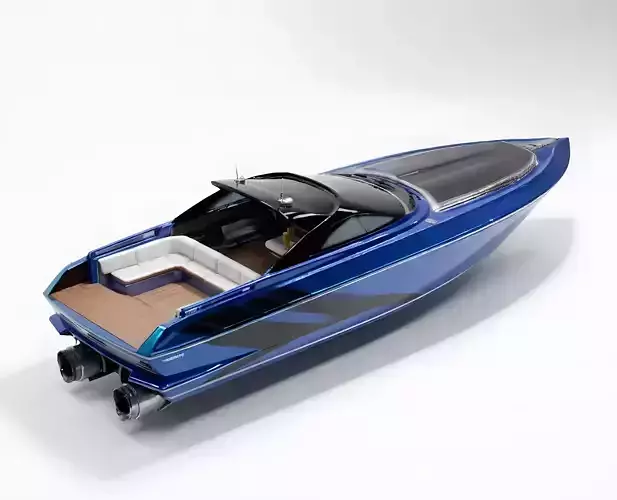 Electric Blue Metallic Paint The hull is coated in a vibrant, electric blue paint with a metallic finish. It’s aggressive and sporty, designed to turn heads. To emphasize the speed, we added sharp, angular black racing stripes (decals) along the side.