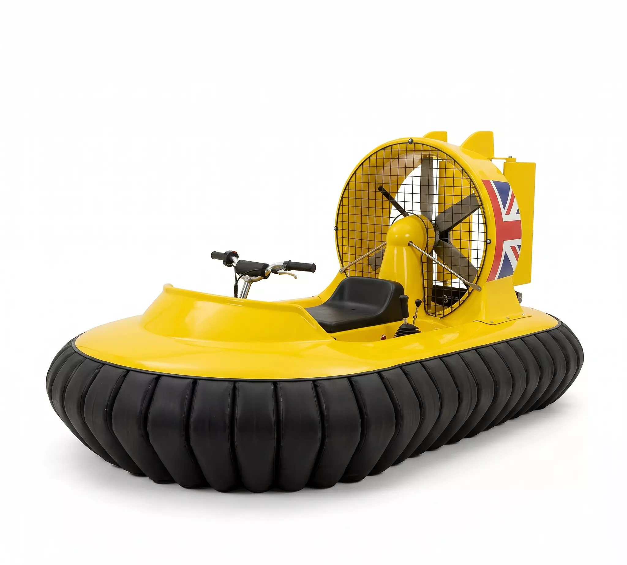This vibrant 3D model captures the compact and versatile British Hovercraft Mini, a lightweight personal hovercraft designed for seamless transitions between land and water. The model is finished in a high-visibility signal yellow, featuring a robust, black segmented air skirt that creates the necessary cushion for multi-terrain travel. Key details include the large rear thrust fan housed in a protective circular safety cage, twin vertical rudders for directional control, and a prominent Union Jack decal on the fan housing that pays homage to its British engineering roots. The cockpit is designed for a single pilot, featuring a simple handlebar steering system, a textured black bucket seat, and a manual throttle lever. This digital asset is perfectly suited for rescue simulation environments, coastal patrol visualizations, or any project requiring a unique and functional amphibious transport.