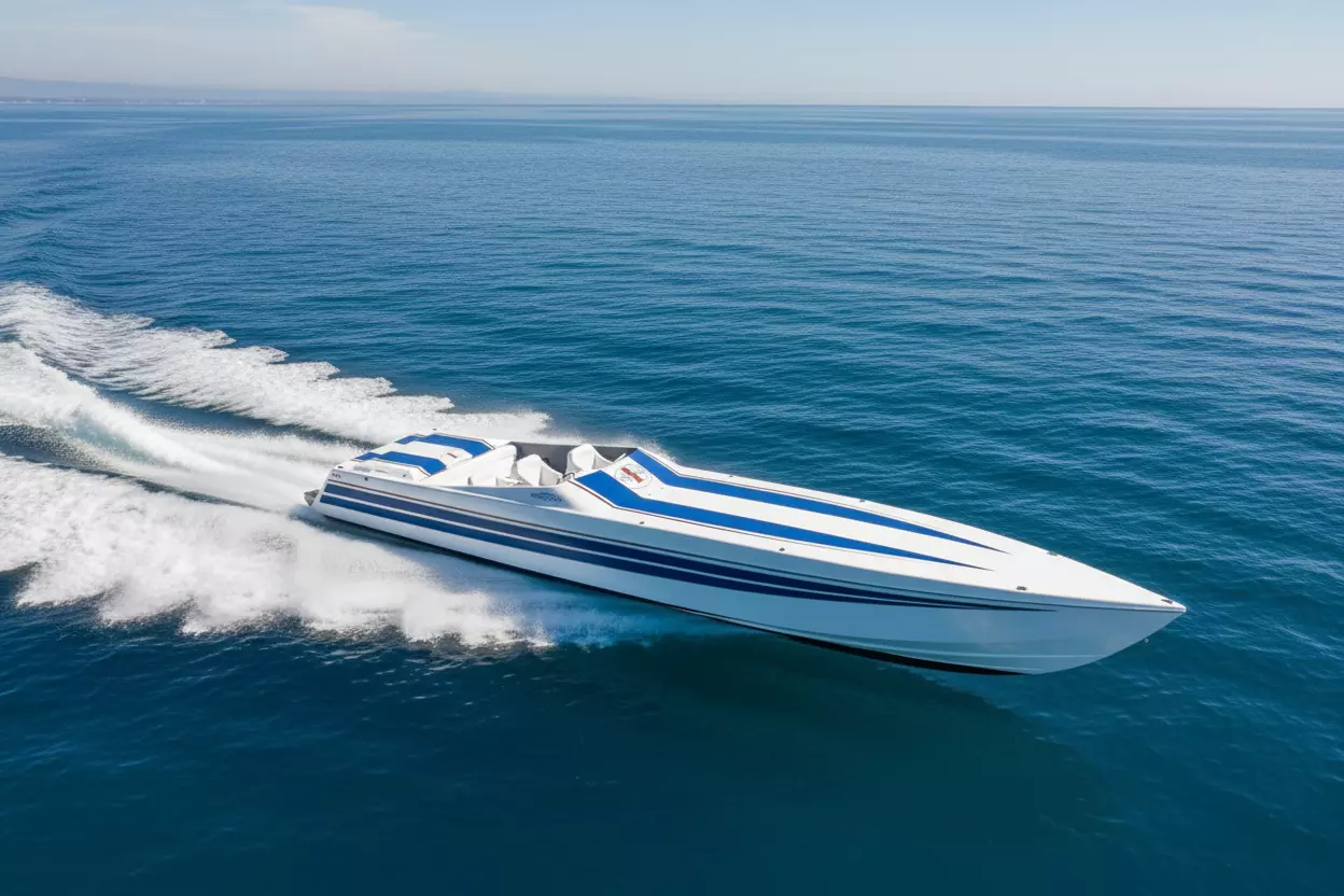 High-quality 3D model of a classic Cigarette Racing-style high-performance speedboat, perfect for offshore racing scenes, luxury marine environments, games, animations, or visualizations. This iconic go-fast boat features a sleek white hull with bold blue and red stripes, twin outboard engines, and an aggressive deep-V design for superior speed and handling.Key features: