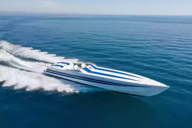 Open cockpit with bolster seats, central helm station, and detailed dashboardTwin stern-mounted outboard engines for realistic high-power performanceSignature Cigarette branding and racing-inspired graphicsAerodynamic deck layout with flush hatches and minimalistic luxury touchesClean geometry optimized for both close-up renders and real-time use