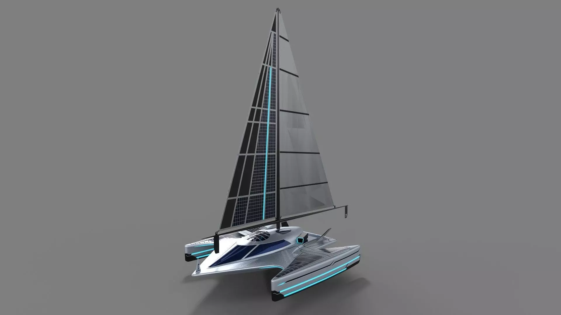 1 A futuristic sailing dinghy with a sleek and angular design, featuring a metallic silver hull and neon blue accents, equipped with advanced solar panels integrated into the sail for eco-friendly propulsion, a transparent cockpit dome for panoramic views, and retractable hydrofoils for smooth gliding over the water.