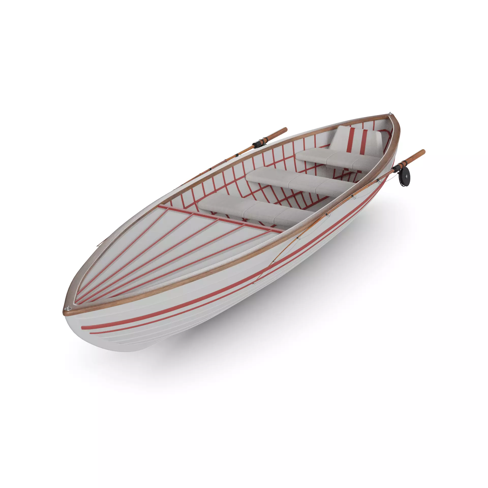 2 A modern rowing dinghy featuring a red and white striped design, with a smooth fiberglass exterior and comfortable cushioned seats, ideal for a relaxing day out on the water in the current era.