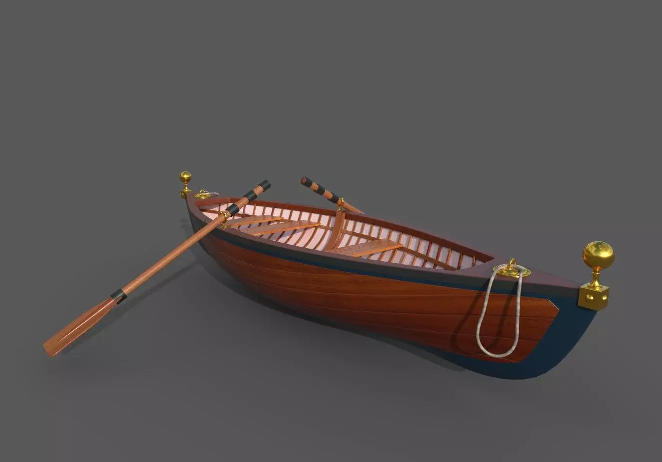 3 An elegant rowing dinghy in a classic wooden finish, complete with brass fittings and a traditional oarlock system, reminiscent of a bygone era but still suitable for a peaceful row in today's times.