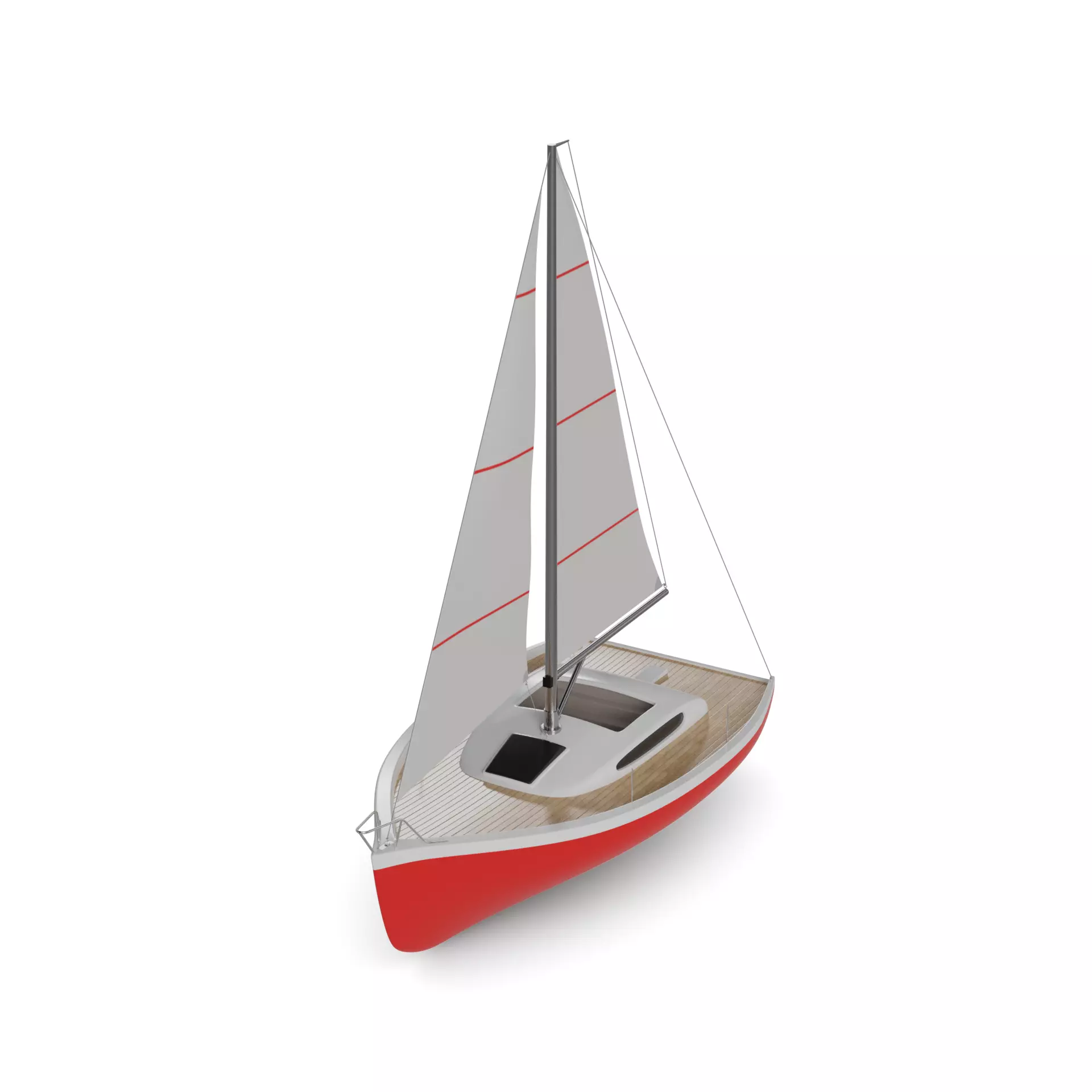A sleek sailing dinghy with a vibrant red hull, perfect for leisurely cruises on calm waters. The boat features a pointed bow and a wide, flat deck, providing stability and comfort for the passengers. The mast stands tall, ready to catch the wind and propel the boat forward effortlessly.