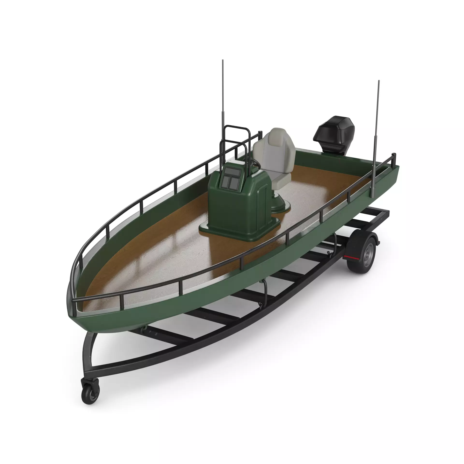 A modern electric fishing boat in a striking green hue, with a sturdy fiberglass body, a trolling motor for silent movement in the water, multiple storage compartments for fishing gear, and a built-in cooler to store the day's catch, ideal for contemporary fishing expeditions.