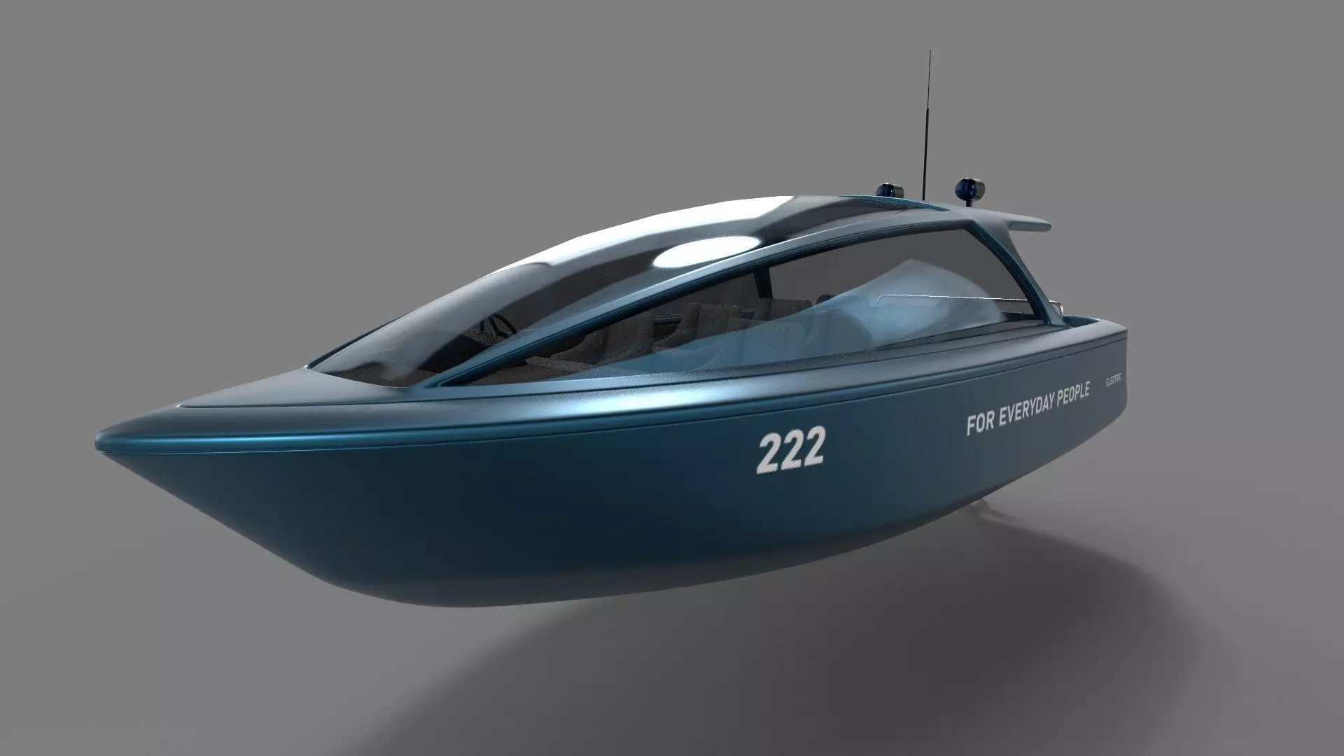 An electric boat designed for civilians, featuring a futuristic design with a transparent hull that allows a view of the water below. The boat is painted in a shimmering blue hue, blending seamlessly with the current timeline. It is powered by advanced electric motors, ensuring a smooth and eco-friendly sailing experience.