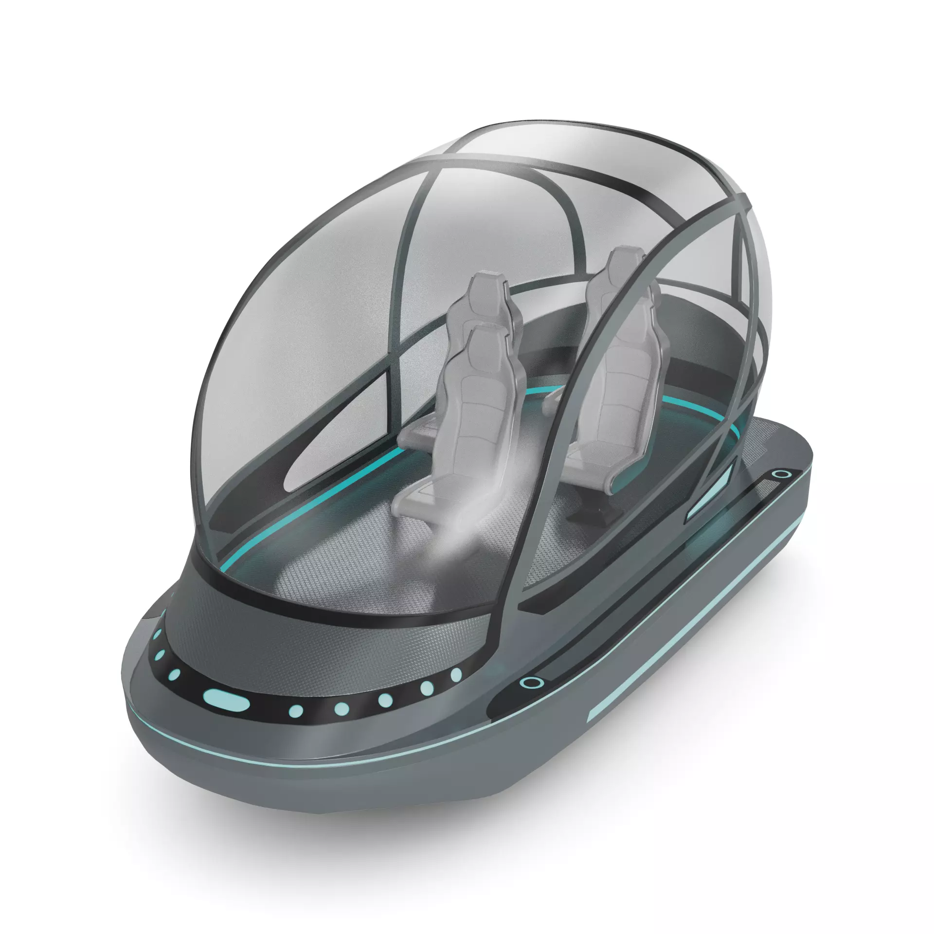 A sleek and futuristic tourist gondola, designed with a transparent dome-shaped roof that offers a panoramic view of the surroundings, featuring a metallic silver exterior with neon blue accents, equipped with advanced propulsion technology for a smooth and silent ride through the waterways of the future.