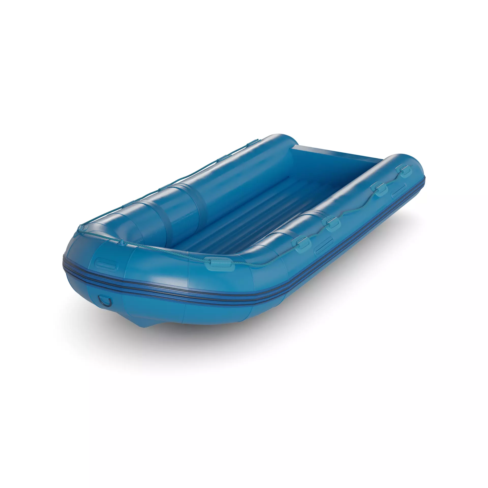 This inflatable dinghy is a vibrant blue color with a sleek and modern design, perfect for civilian use on the water in the current timeline. It features sturdy handles for easy transportation and a durable, inflatable construction for safety and stability.