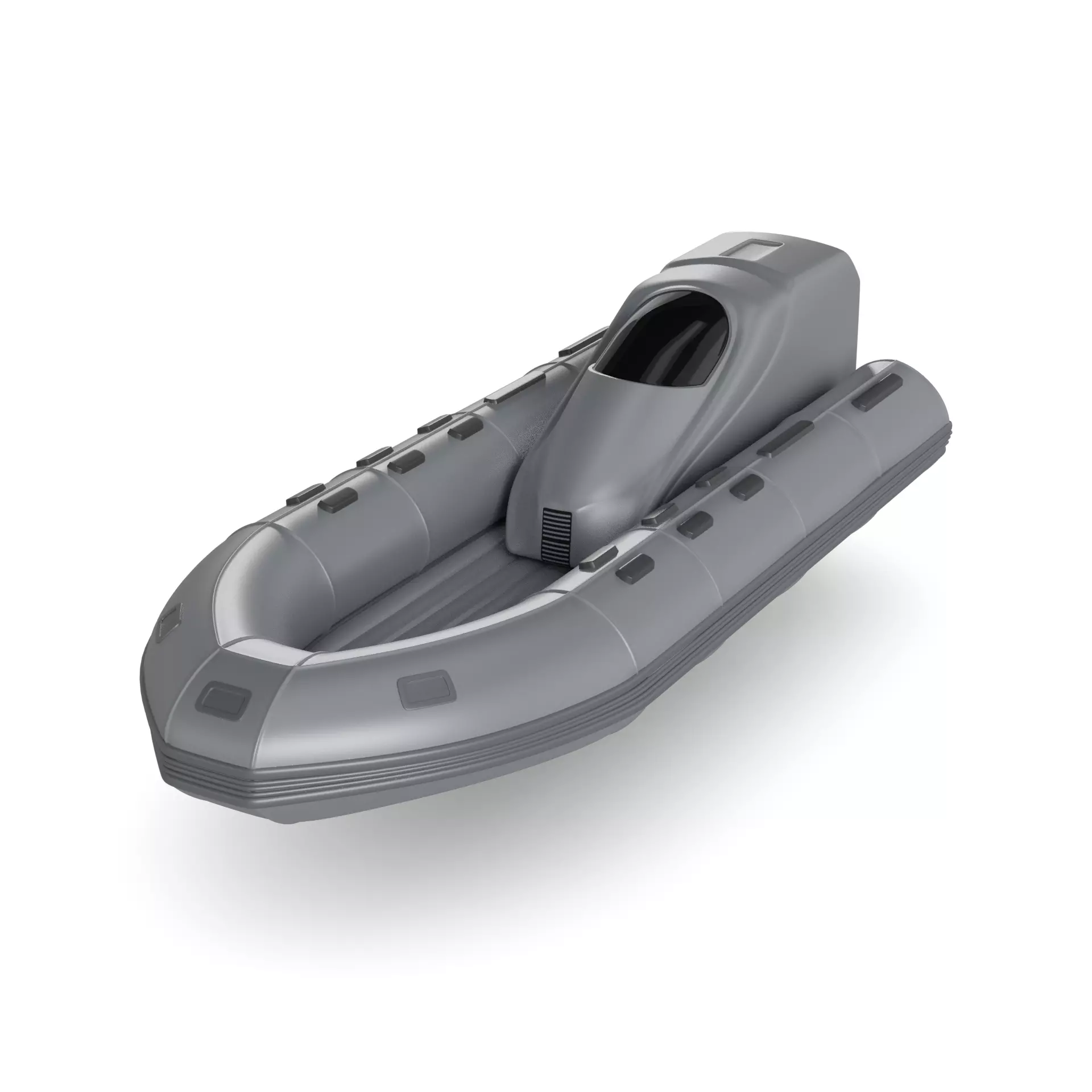 A futuristic civilian inflatable dinghy in sleek silver color with a matte finish, featuring a streamlined shape and advanced inflatable technology for easy transport and storage.