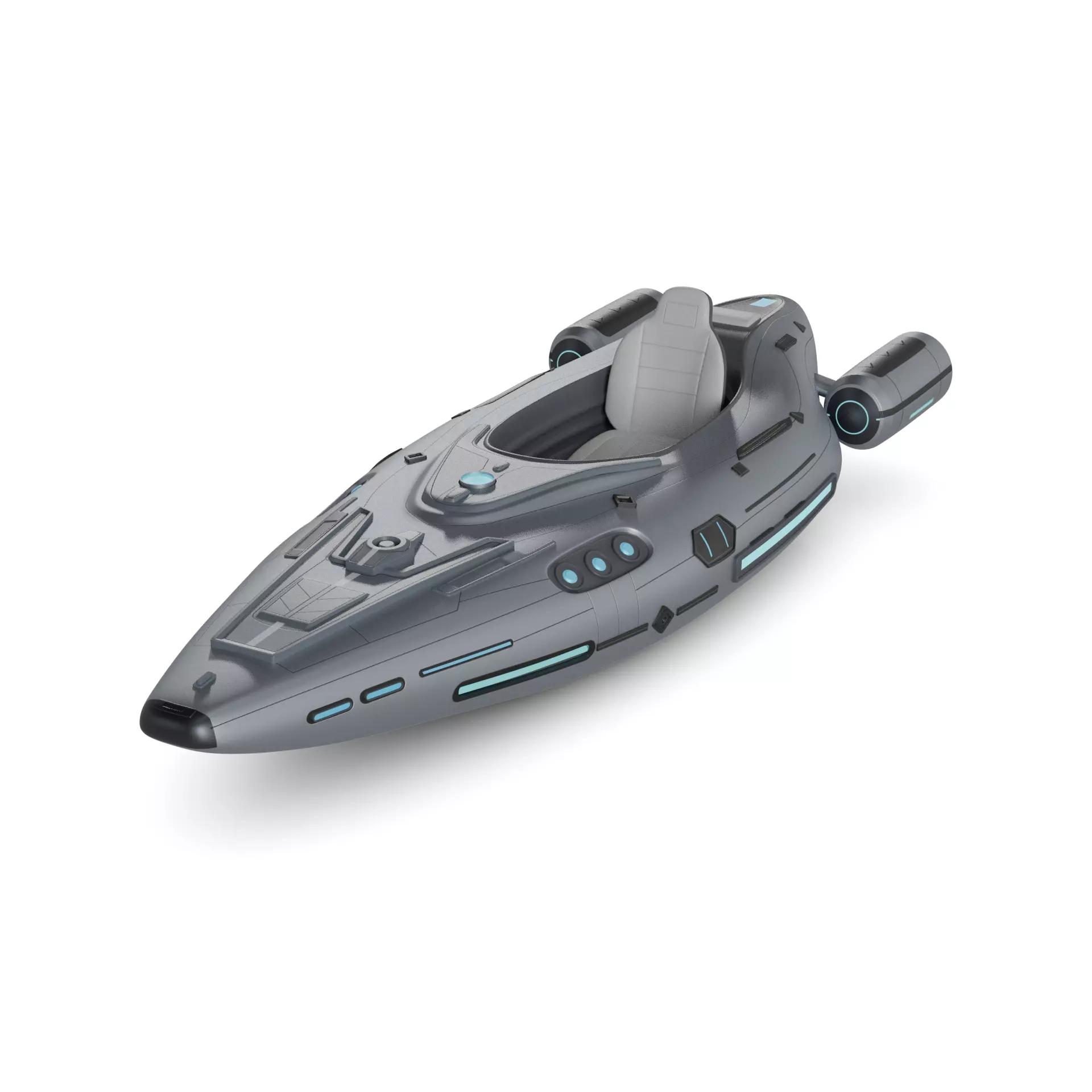 A futuristic solo inflatable kayak designed for civilian use in the future, featuring a sleek and aerodynamic shape with a metallic silver color scheme and neon blue accents, equipped with advanced inflatable technology for maximum stability and maneuverability on the water.