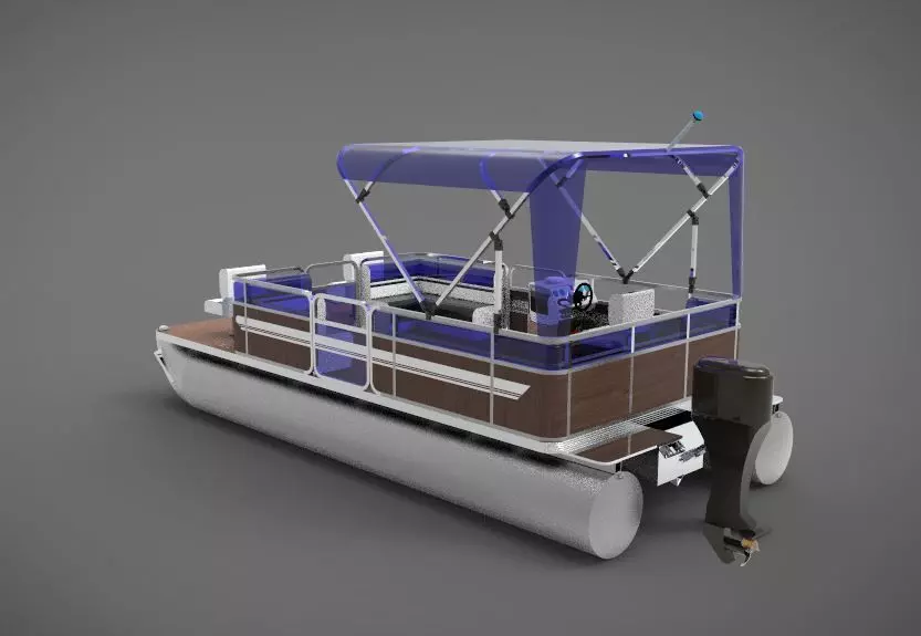 The 3D model design of a lake pontoon boat captures the unique structure and functionality of these versatile watercraft. The model showcases a stable, wide platform supported by twin or triple pontoons that provide exceptional buoyancy. The spacious deck is designed with ample seating and space for various activities, with detailed features like comfortable cushioned benches, a pilot's console, and a sturdy railing for safety. There's often a retractable canopy to provide shade, and the deck layout can include additional elements like a table, storage compartments, and even a small kitchenette for extended outings. This 3D model accurately represents the balance of leisure and practicality, illustrating why pontoon boats are popular choices for relaxed days on the lake