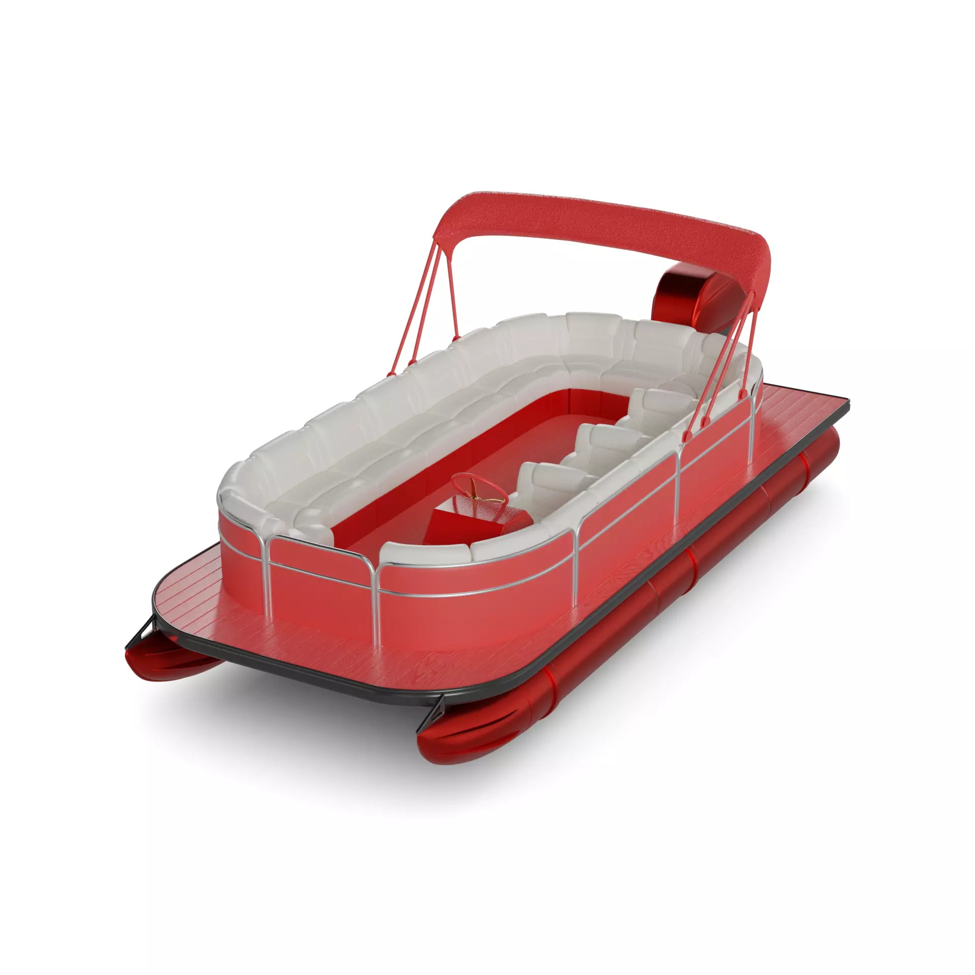A family-friendly pontoon boat designed for leisurely outings on the water in the historical timeline, characterized by its vibrant red color scheme, multiple built-in cup holders, and a large canopy for shade, providing a comfortable and enjoyable boating experience for all ages.